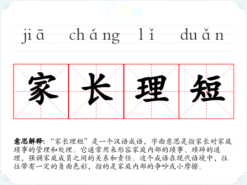 “家长理短”是一个汉语成语,字面意思是指家长对家庭琐事的管理和处理。它通常用来形容家庭内部的琐事、琐碎的道理,强调家庭成员之间的关系和责任。这个成语在现代语境中,往往带有一定的负面色彩,指的是家庭内部的争吵或小摩擦。