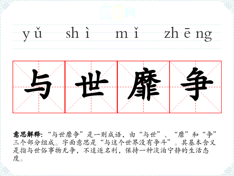 “与世靡争”是一则成语,由“与世”、“靡”和“争”三个部分组成。字面意思是“与这个世界没有争斗”。其基本含义是指与世俗事物无争,不追逐名利,保持一种淡泊宁静的生活态度。
