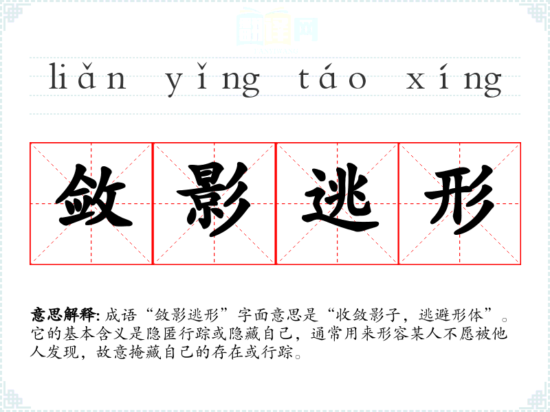 成语“敛影逃形”字面意思是“收敛影子,逃避形体”。它的基本含义是隐匿行踪或隐藏自己,通常用来形容某人不愿被他人发现,故意掩藏自己的存在或行踪。