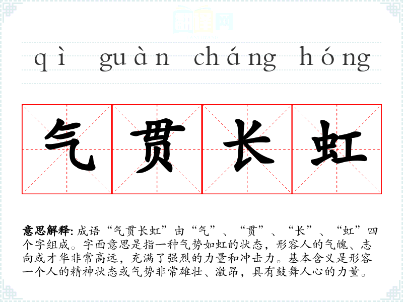 成语“气贯长虹”由“气”、“贯”、“长”、“虹”四个字组成。字面意思是指一种气势如虹的状态,形容人的气魄、志向或才华非常高远,充满了强烈的力量和冲击力。基本含义是形容一个人的精神状态或气势非常雄壮、激昂,具有鼓舞人心的力量。