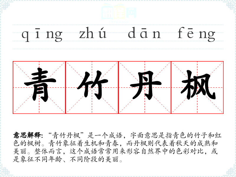 “青竹丹枫”是一个成语,字面意思是指青色的竹子和红色的枫树。青竹象征着生机和青春,而丹枫则代表着秋天的成熟和美丽。整体而言,这个成语常常用来形容自然界中的色彩对比,或是象征不同年龄、不同阶段的美丽。