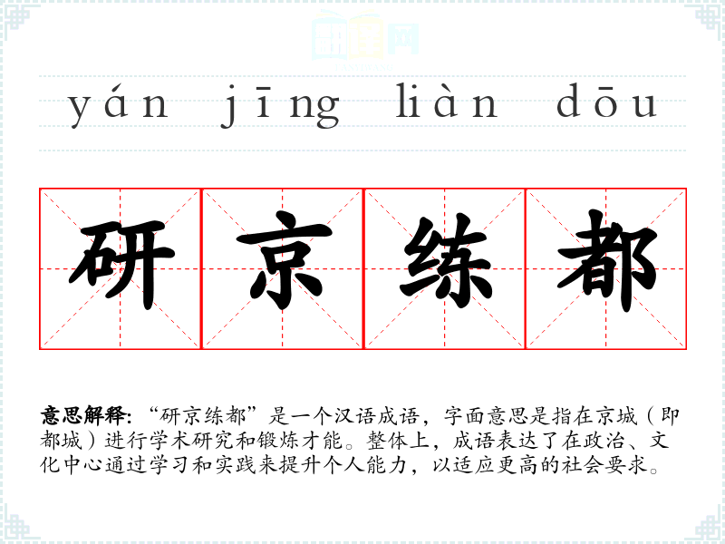 “研京练都”并没有明确的历史出处,可能是现代人对传统文化理念的总结。成语中的“研”指的是研究、探讨;“京”指的是京城,象征着政治和文化的中心;“练”则意味着锻炼、提升;“都”同样指的是都城。这个成语反映了古代士人追求学问与能力提升的理想。