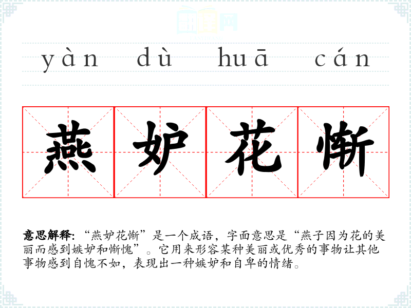 | 燕妒花惭 | 形容女子貌美,使燕子忌妒,使花儿感到羞愧。 |