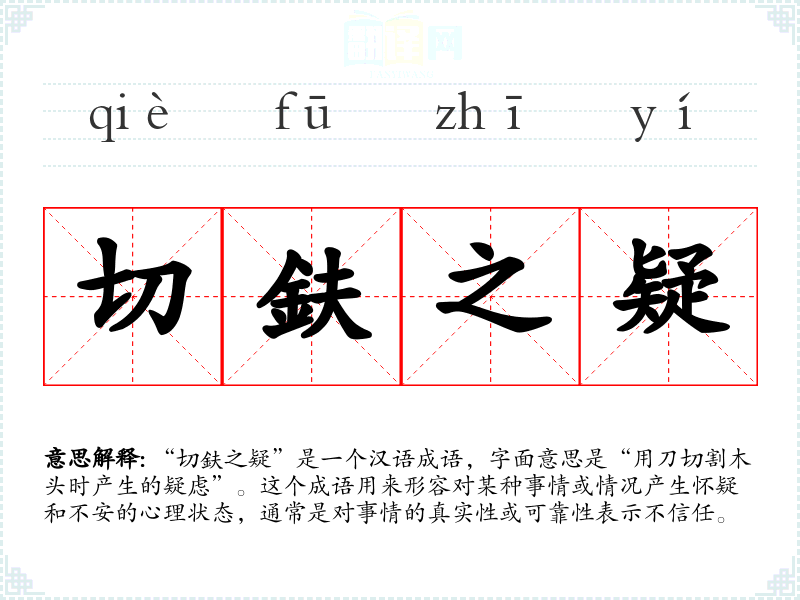 “切鈇之疑”是一个汉语成语,字面意思是“用刀切割木头时产生的疑虑”。这个成语用来形容对某种事情或情况产生怀疑和不安的心理状态,通常是对事情的真实性或可靠性表示不信任。