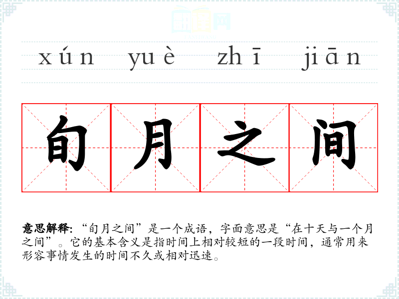 “旬月之间”并没有明确的历史典故或特定的文学出处,但其构造结合了“旬”(十天)与“月”(一个月),反映了**传统的时间观念。在古代,旬和月是常用的时间单位,表示时间的流逝和变化。