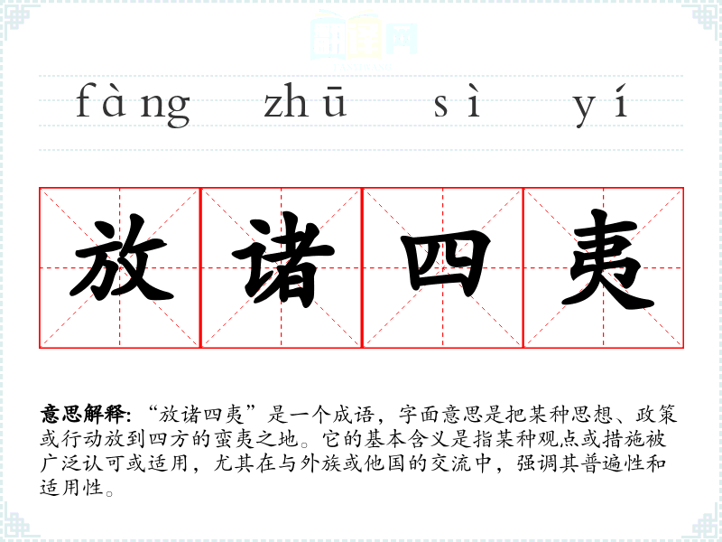 “放诸四夷”是一个成语,字面意思是把某种思想、政策或行动放到四方的蛮夷之地。它的基本含义是指某种观点或措施被广泛认可或适用,尤其在与外族或他国的交流中,强调其普遍性和适用性。