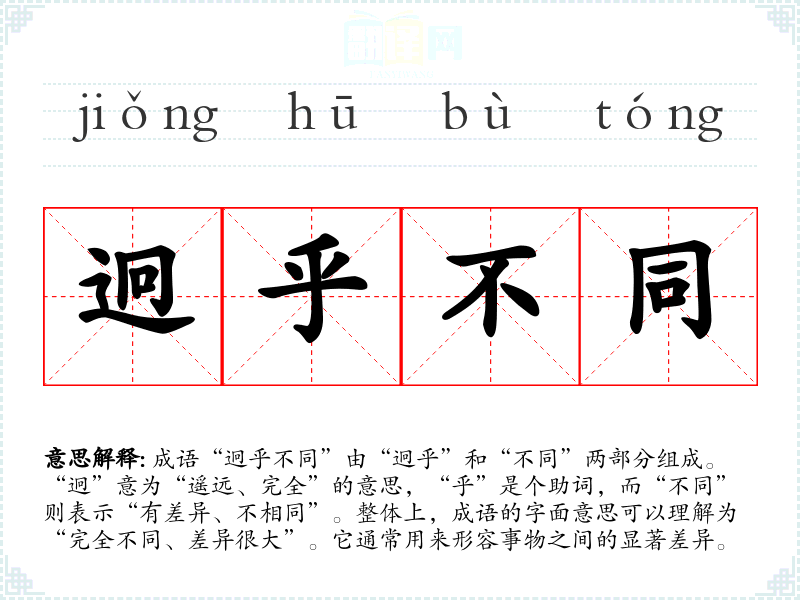 成语“迥乎不同”由“迥乎”和“不同”两部分组成。“迥”意为“遥远、完全”的意思,“乎”是个助词,而“不同”则表示“有差异、不相同”。整体上,成语的字面意思可以理解为“完全不同、差异很大”。它通常用来形容事物之间的显著差异。