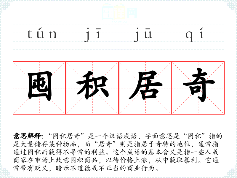 “囤积居奇”是一个汉语成语,字面意思是“囤积”指的是大量储存某种物品,而“居奇”则是指居于奇特的地位,通常指通过囤积而获得不寻常的利益。这个成语的基本含义是指一些人或商家在市场上故意囤积商品,以待价格上涨,从中获取暴利。它通常带有贬义,暗示不道德或不正当的商业行为。