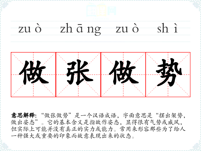 “做张做势”是一个汉语成语,字面意思是“摆出架势,做出姿态”。它的基本含义是指故作姿态,显得很有气势或威风,但实际上可能并没有真正的实力或能力。常用来形容那些为了给人一种强大或重要的印象而故意表现出来的状态。