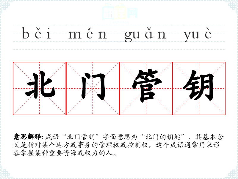 成语“北门管钥”字面意思为“北门的钥匙”,其基本含义是指对某个地方或事务的管理权或控制权。这个成语通常用来形容掌握某种重要资源或权力的人。