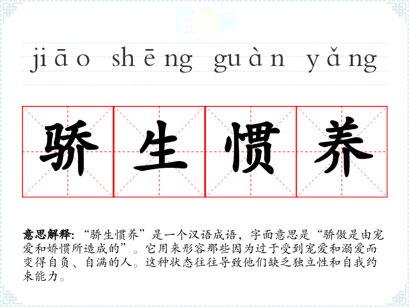 “骄生惯养”是一个汉语成语,字面意思是“骄傲是由宠爱和娇惯所造成的”。它用来形容那些因为过于受到宠爱和溺爱而变得自负、自满的人。这种状态往往导致他们缺乏独立性和自我约束能力。