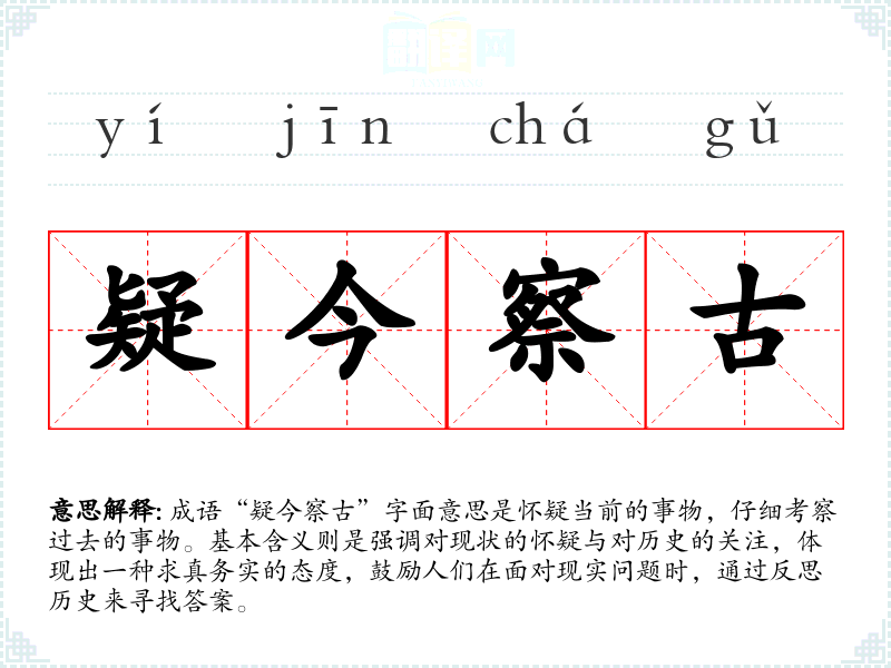 - 日常对话:朋友间讨论社会现象时,提到“疑今察古”可以表达需要借鉴历史经验。