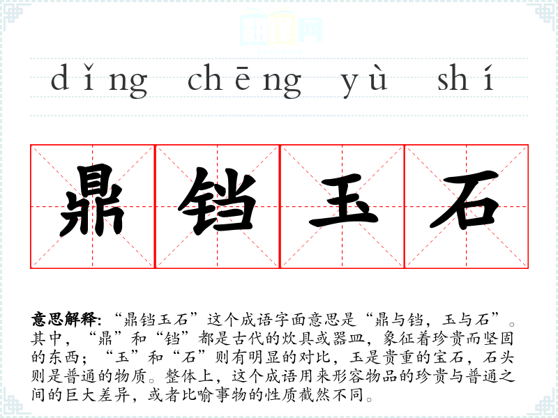 “鼎铛玉石”这个成语字面意思是“鼎与铛,玉与石”。其中,“鼎”和“铛”都是古代的炊具或器皿,象征着珍贵而坚固的东西;“玉”和“石”则有明显的对比,玉是贵重的宝石,石头则是普通的物质。整体上,这个成语用来形容物品的珍贵与普通之间的巨大差异,或者比喻事物的性质截然不同。