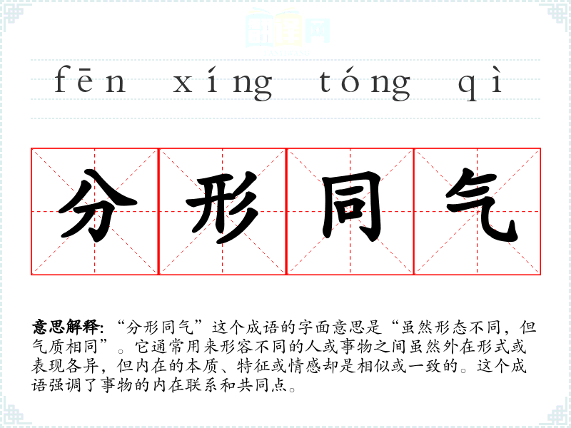 “分形同气”这个成语的字面意思是“虽然形态不同,但气质相同”。它通常用来形容不同的人或事物之间虽然外在形式或表现各异,但内在的本质、特征或情感却是相似或一致的。这个成语强调了事物的内在联系和共同点。