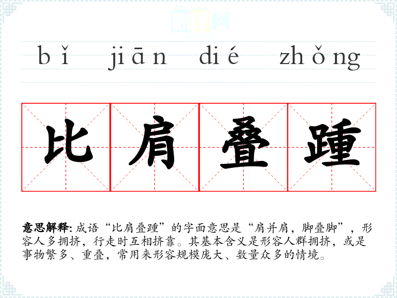 成语“比肩叠踵”的字面意思是“肩并肩,脚叠脚”,形容人多拥挤,行走时互相挤靠。其基本含义是形容人群拥挤,或是事物繁多、重叠,常用来形容规模庞大、数量众多的情境。