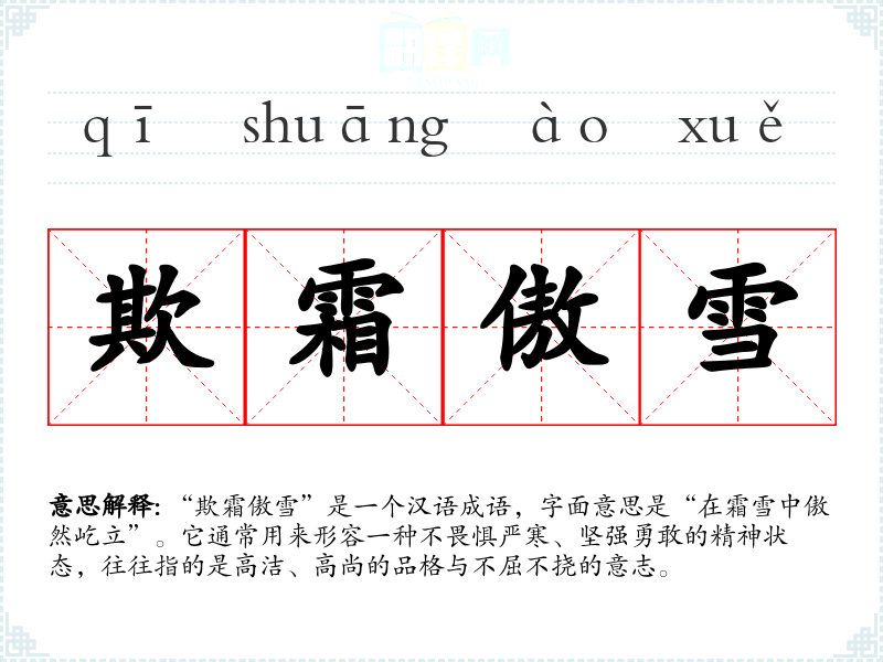 “欺霜傲雪”是一个汉语成语,字面意思是“在霜雪中傲然屹立”。它通常用来形容一种不畏惧严寒、坚强勇敢的精神状态,往往指的是高洁、高尚的品格与不屈不挠的意志。