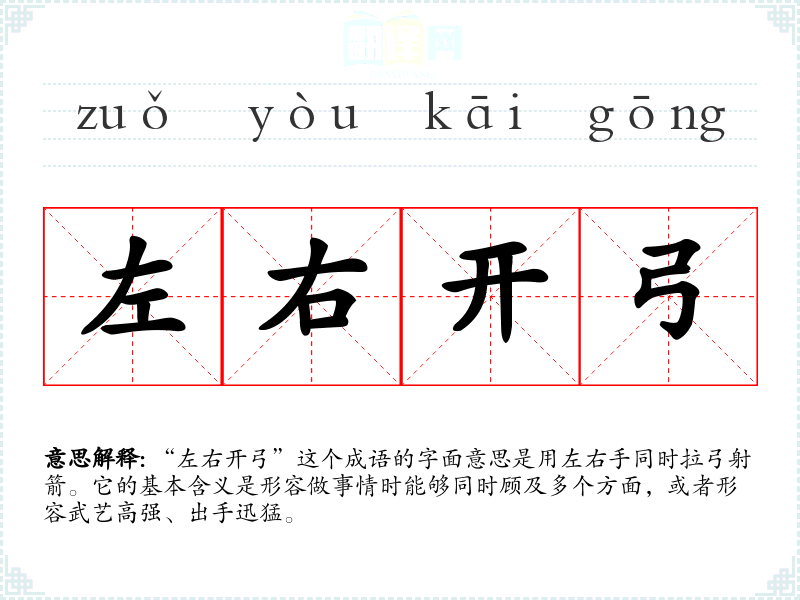 “左右开弓”这个成语的字面意思是用左右手同时拉弓射箭。它的基本含义是形容做事情时能够同时顾及多个方面,或者形容武艺高强、出手迅猛。