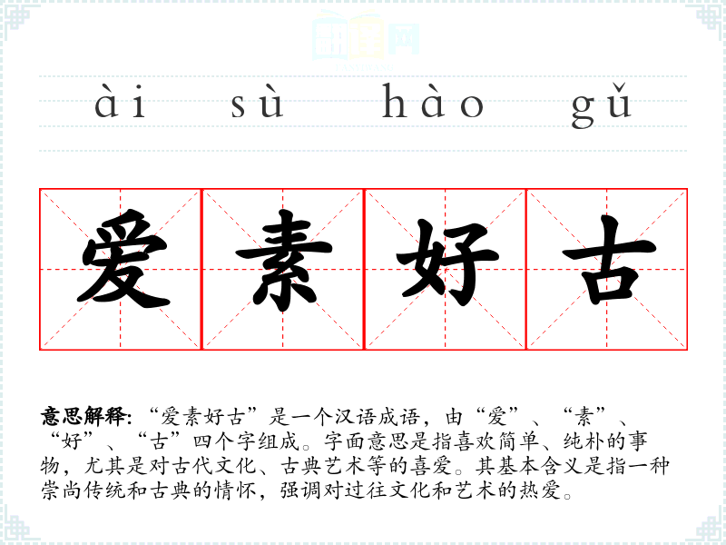 “爱素好古”是一个汉语成语,由“爱”、“素”、“好”、“古”四个字组成。字面意思是指喜欢简单、纯朴的事物,尤其是对古代文化、古典艺术等的喜爱。其基本含义是指一种崇尚传统和古典的情怀,强调对过往文化和艺术的热爱。