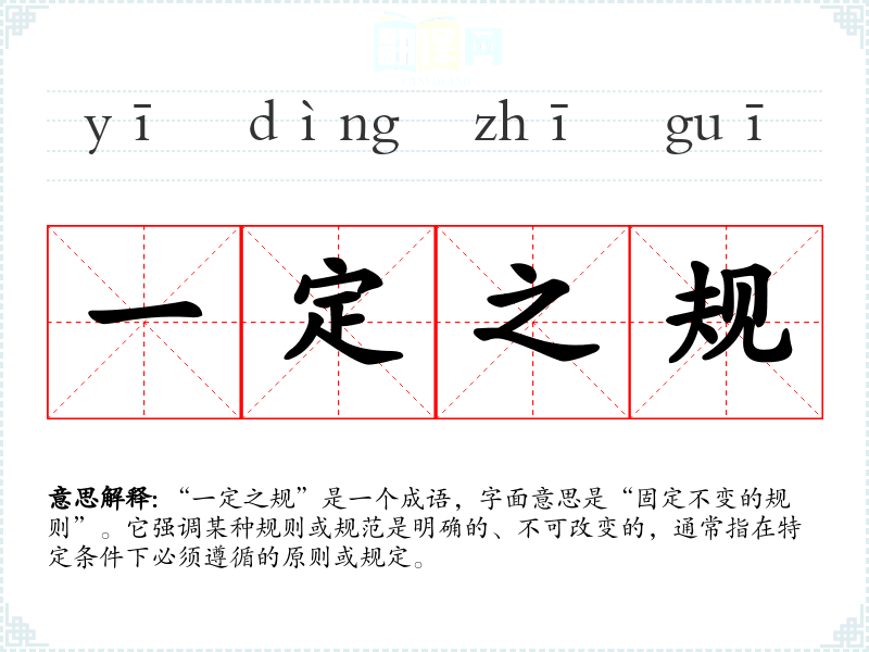 “一定之规”是一个成语,字面意思是“固定不变的规则”。它强调某种规则或规范是明确的、不可改变的,通常指在特定条件下必须遵循的原则或规定。
