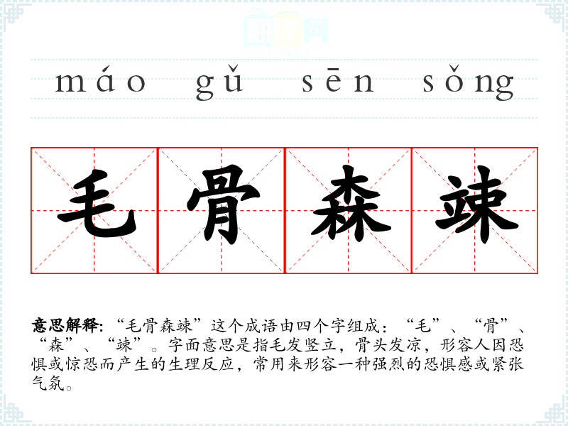 “毛骨森竦”这个成语由四个字组成:“毛”、“骨”、“森”、“竦”。字面意思是指毛发竖立,骨头发凉,形容人因恐惧或惊恐而产生的生理反应,常用来形容一种强烈的恐惧感或紧张气氛。