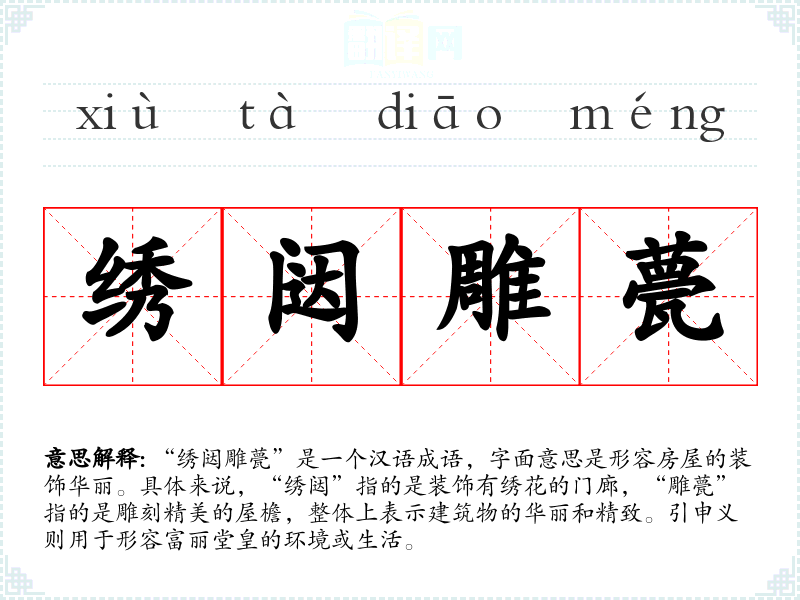 该成语的来源可追溯至《楚辞·九章·惜诵》中的“绣闼雕甍,朱华镂雕,雕甍绣闼,云销雨霁。”在古代文学中,常用来描绘宫殿、府邸的奢华与美丽,体现了古人对美好生活的向往。