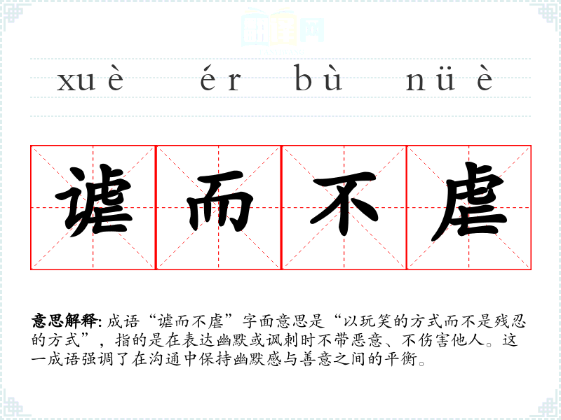 成语“谑而不虐”字面意思是“以玩笑的方式而不是残忍的方式”,指的是在表达幽默或讽刺时不带恶意、不伤害他人。这一成语强调了在沟通中保持幽默感与善意之间的平衡。