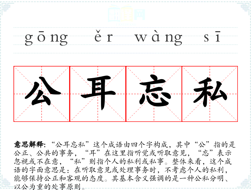 “公耳忘私”这个成语由四个字构成,其中“公”指的是公正、公共的事务,“耳”在这里指听觉或听取意见,“忘”表示忽视或不在意,“私”则指个人的私利或私事。整体来看,这个成语的字面意思是:在听取意见或处理事务时,不考虑个人的私利,能够保持公正和客观的态度。其基本含义强调的是一种公私分明、以公为重的处事原则。