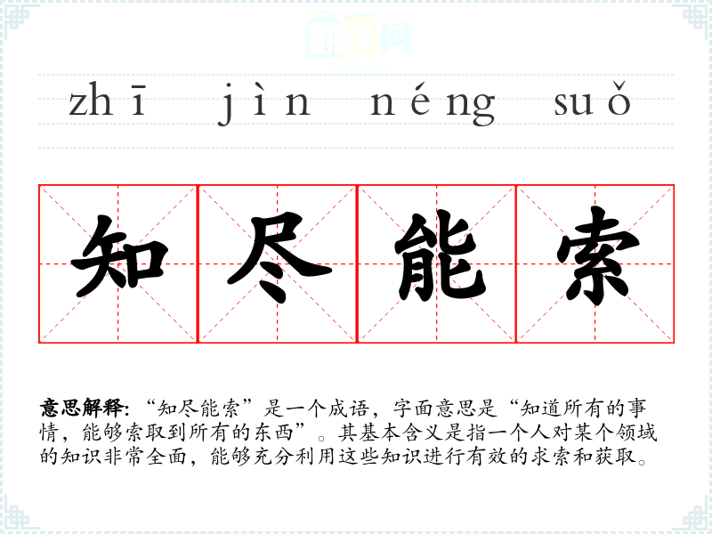 “知尽能索”是一个成语,字面意思是“知道所有的事情,能够索取到所有的东西”。其基本含义是指一个人对某个领域的知识非常全面,能够充分利用这些知识进行有效的求索和获取。