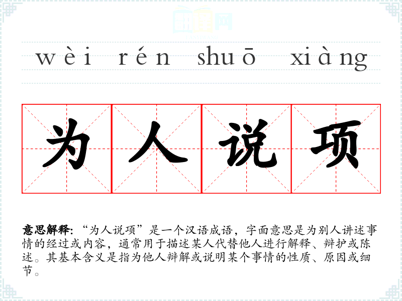 “为人说项”是一个汉语成语,字面意思是为别人讲述事情的经过或内容,通常用于描述某人代替他人进行解释、辩护或陈述。其基本含义是指为他人辩解或说明某个事情的性质、原因或细节。