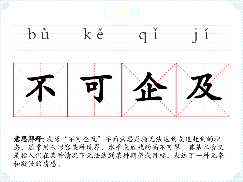 “不可企及”这一成语的具体历史背景不详,但其构成的词汇中,“企”有试图、想要的意思,“及”则有达到、赶上的含义。结合在一起,表达了一个人或事物在某种程度上是难以接近或无法达到的。这种表达方式在古代文学中常见,常用来形容天才、英雄人物或高尚品质,强调某种超凡脱俗的特质。