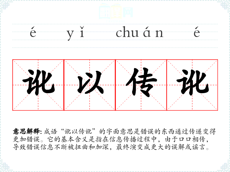 成语“讹以传讹”的字面意思是错误的东西通过传递变得更加错误。它的基本含义是指在信息传播过程中,由于口口相传,导致错误信息不断被扭曲和加深,最终演变成更大的误解或谣言。