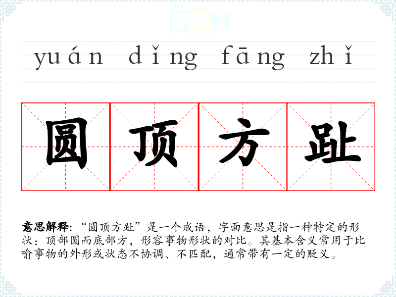 “圆顶方趾”是一个成语,字面意思是指一种特定的形状:顶部圆而底部方,形容事物形状的对比。其基本含义常用于比喻事物的外形或状态不协调、不匹配,通常带有一定的贬义。
