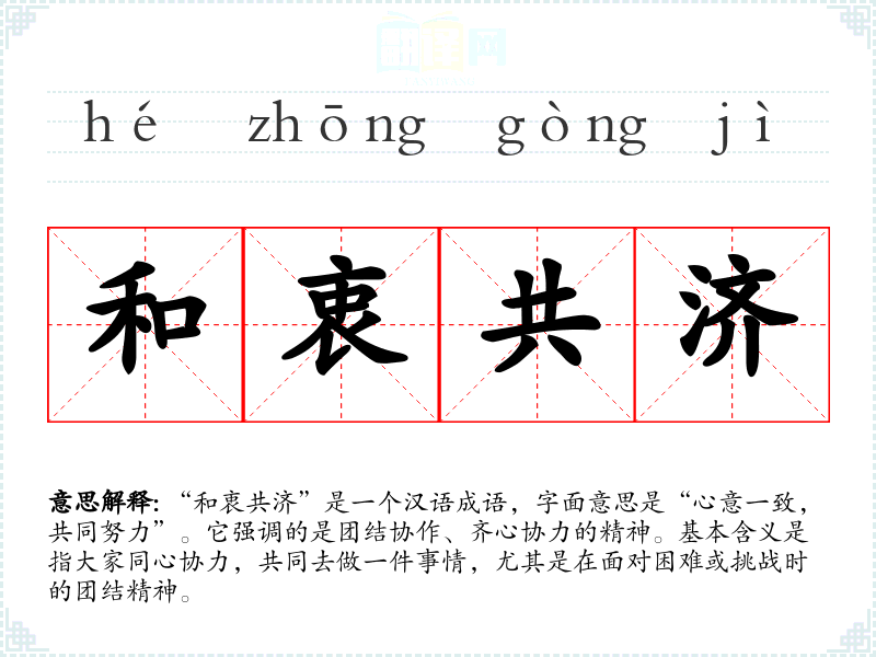 “和衷共济”是一个汉语成语,字面意思是“心意一致,共同努力”。它强调的是团结协作、齐心协力的精神。基本含义是指大家同心协力,共同去做一件事情,尤其是在面对困难或挑战时的团结精神。