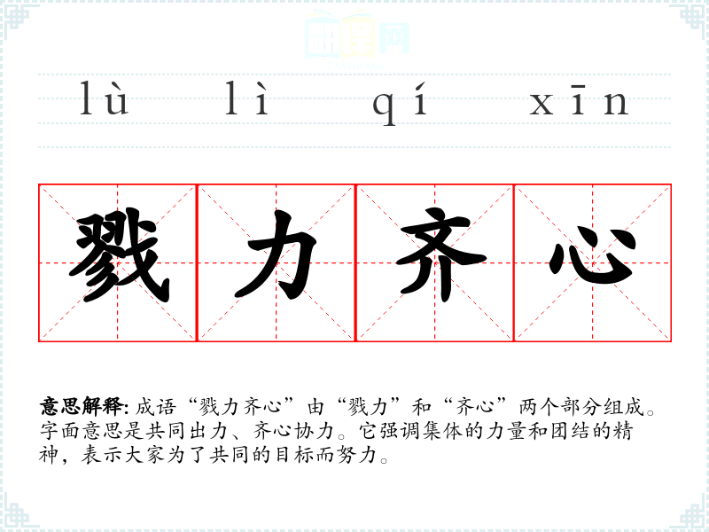 成语“戮力齐心”由“戮力”和“齐心”两个部分组成。字面意思是共同出力、齐心协力。它强调集体的力量和团结的精神,表示大家为了共同的目标而努力。