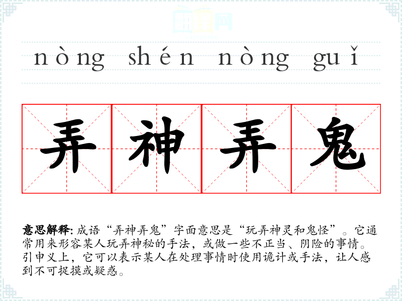 成语“弄神弄鬼”字面意思是“玩弄神灵和鬼怪”。它通常用来形容某人玩弄神秘的手法,或做一些不正当、阴险的事情。引申义上,它可以表示某人在处理事情时使用诡计或手法,让人感到不可捉摸或疑惑。
