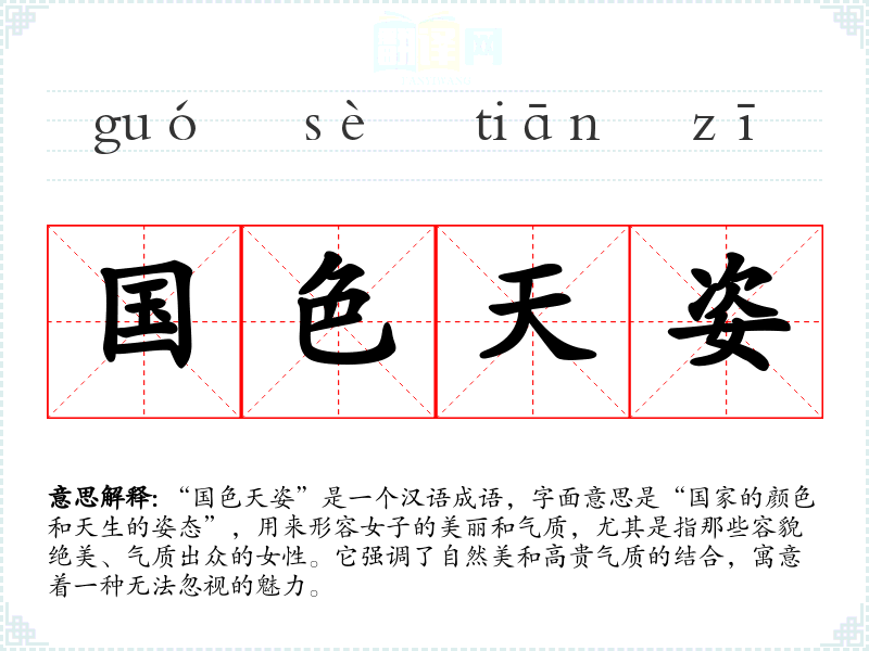 | 国色天姿 | 国色:女子美色冠绝全国;天姿:天生的姿色。旧时形容女子容貌极美。 |