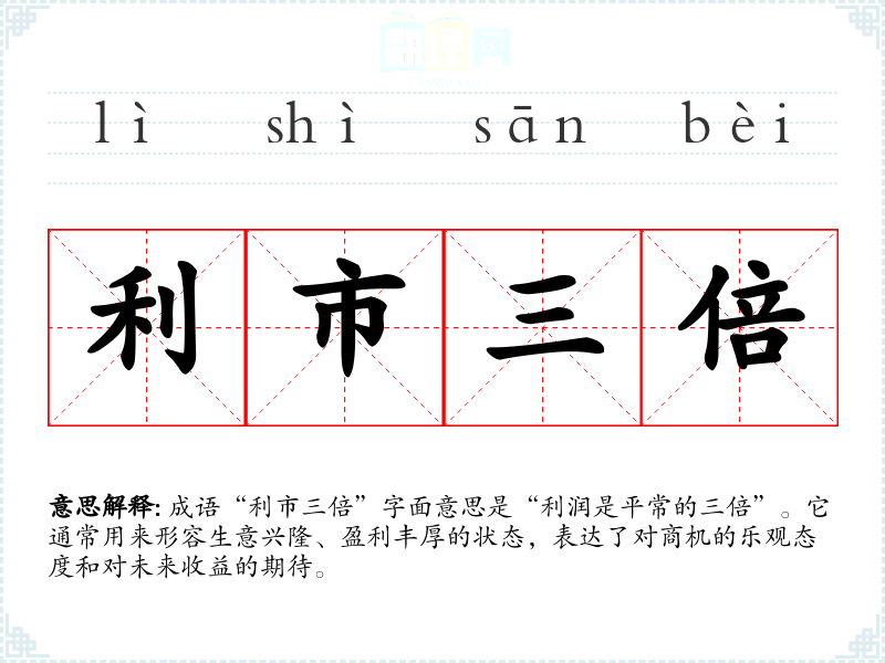 成语“利市三倍”字面意思是“利润是平常的三倍”。它通常用来形容生意兴隆、盈利丰厚的状态,表达了对商机的乐观态度和对未来收益的期待。