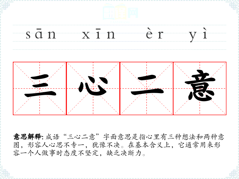 成语“三心二意”字面意思是指心里有三种想法和两种意图,形容人心思不专一,犹豫不决。在基本含义上,它通常用来形容一个人做事时态度不坚定,缺乏决断力。