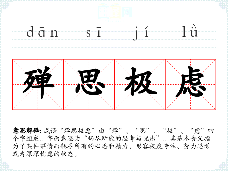 成语“殚思极虑”由“殚”、“思”、“极”、“虑”四个字组成。字面意思为“竭尽所能的思考与忧虑”。其基本含义指为了某件事情而耗尽所有的心思和精力,形容极度专注、努力思考或者深深忧虑的状态。