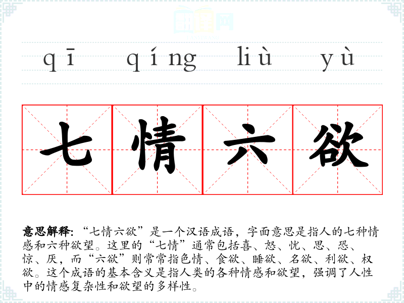 “七情六欲”是一个汉语成语,字面意思是指人的七种情感和六种欲望。这里的“七情”通常包括喜、怒、忧、思、恐、惊、厌,而“六欲”则常常指色情、食欲、睡欲、名欲、利欲、权欲。这个成语的基本含义是指人类的各种情感和欲望,强调了人性中的情感复杂性和欲望的多样性。