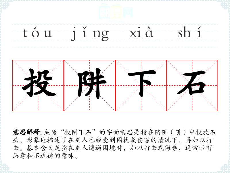 成语“投阱下石”的字面意思是指在陷阱(阱)中投放石头,形象地描述了在别人已经受到困扰或伤害的情况下,再加以打击。基本含义是指在别人遭遇困境时,加以打击或侮辱,通常带有恶意和不道德的意味。