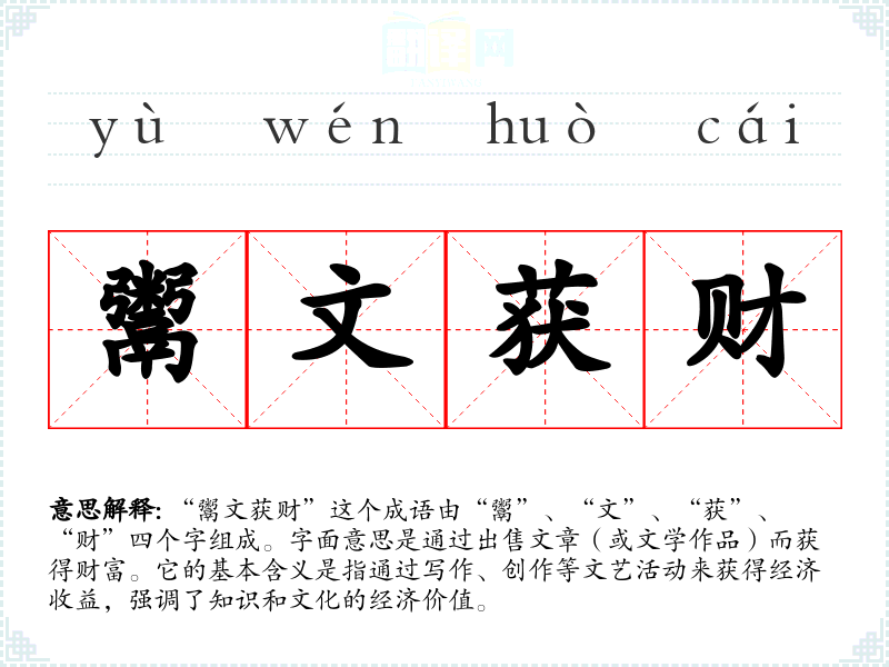 “鬻文获财”这个成语由“鬻”、“文”、“获”、“财”四个字组成。字面意思是通过出售文章(或文学作品)而获得财富。它的基本含义是指通过写作、创作等文艺活动来获得经济收益,强调了知识和文化的经济价值。