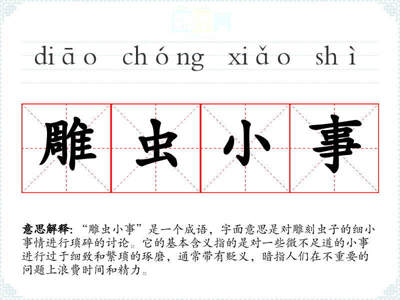 “雕虫小事”是一个成语,字面意思是对雕刻虫子的细小事情进行琐碎的讨论。它的基本含义指的是对一些微不足道的小事进行过于细致和繁琐的琢磨,通常带有贬义,暗指人们在不重要的问题上浪费时间和精力。