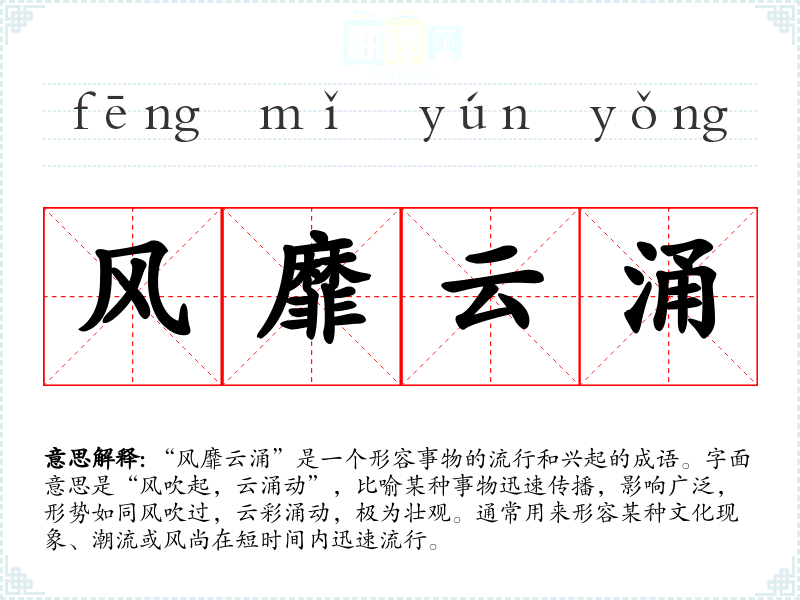 “风靡云涌”是一个形容事物的流行和兴起的成语。字面意思是“风吹起,云涌动”,比喻某种事物迅速传播,影响广泛,形势如同风吹过,云彩涌动,极为壮观。通常用来形容某种文化现象、潮流或风尚在短时间内迅速流行。