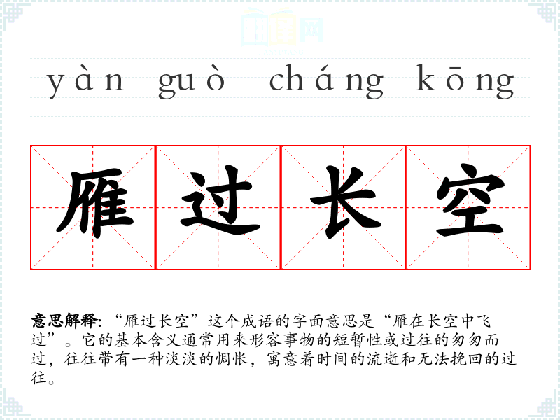 “雁过长空”这个成语的字面意思是“雁在长空中飞过”。它的基本含义通常用来形容事物的短暂性或过往的匆匆而过,往往带有一种淡淡的惆怅,寓意着时间的流逝和无法挽回的过往。