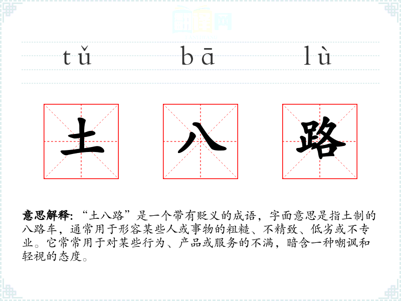 “土八路”是一个带有贬义的成语,字面意思是指土制的八路车,通常用于形容某些人或事物的粗糙、不精致、低劣或不专业。它常常用于对某些行为、产品或服务的不满,暗含一种嘲讽和轻视的态度。