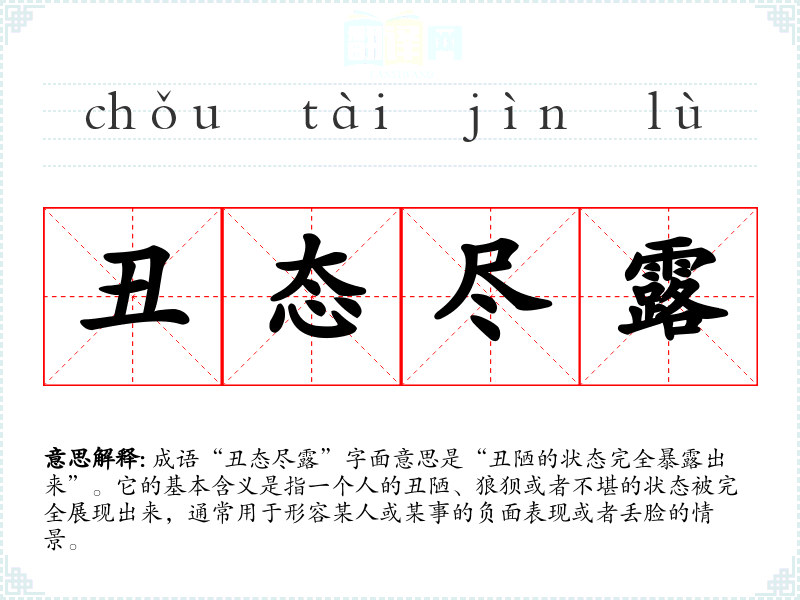 成语“丑态尽露”字面意思是“丑陋的状态完全暴露出来”。它的基本含义是指一个人的丑陋、狼狈或者不堪的状态被完全展现出来,通常用于形容某人或某事的负面表现或者丢脸的情景。