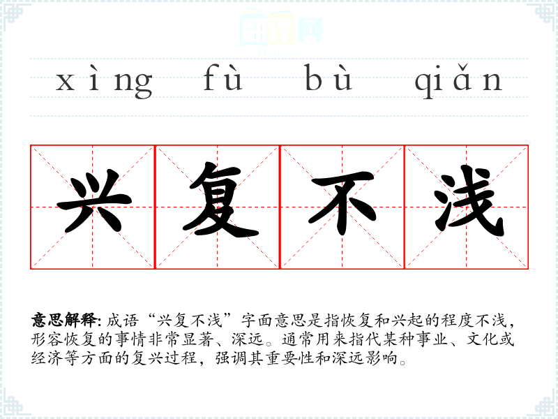 成语“兴复不浅”字面意思是指恢复和兴起的程度不浅,形容恢复的事情非常显著、深远。通常用来指代某种事业、文化或经济等方面的复兴过程,强调其重要性和深远影响。