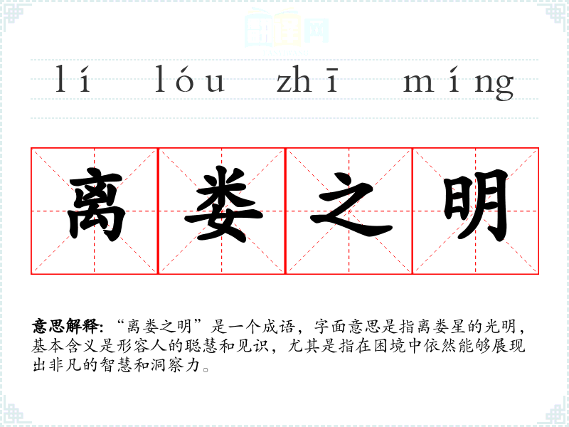 “离娄之明”是一个成语,字面意思是指离娄星的光明,基本含义是形容人的聪慧和见识,尤其是指在困境中依然能够展现出非凡的智慧和洞察力。