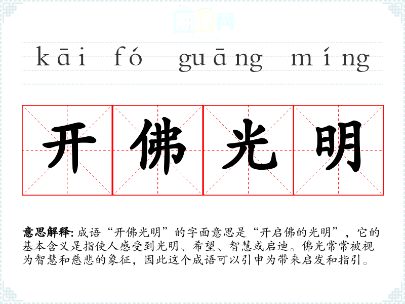 成语“开佛光明”的字面意思是“开启佛的光明”,它的基本含义是指使人感受到光明、希望、智慧或启迪。佛光常常被视为智慧和慈悲的象征,因此这个成语可以引申为带来启发和指引。